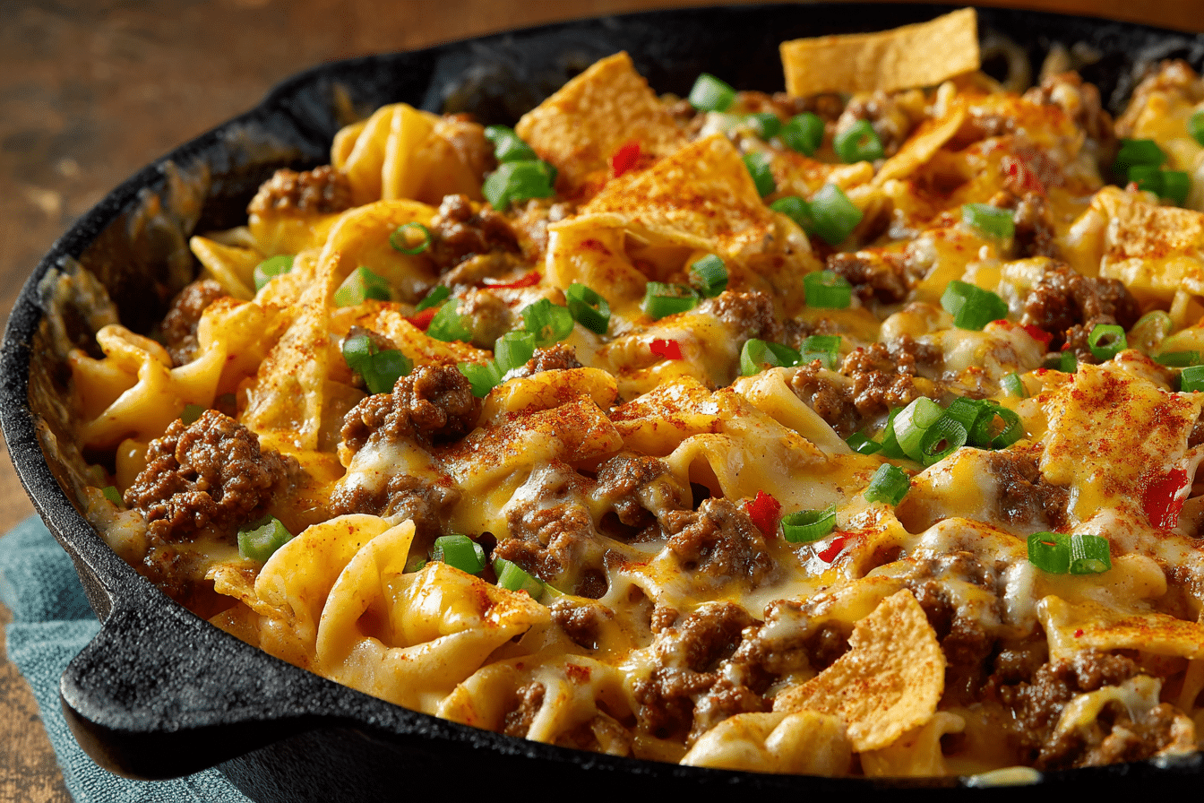 Perfect for nights when you want comfort food without the casserole prep. Everything cooks in a skillet—from browning the beef to melting the cheese—so cleanup is easy and the result is deeply satisfying. The Cheesy Crunchwrap Beef Pasta Skillet isn’t just another pasta dish—it’s a one-pan flavor bomb.