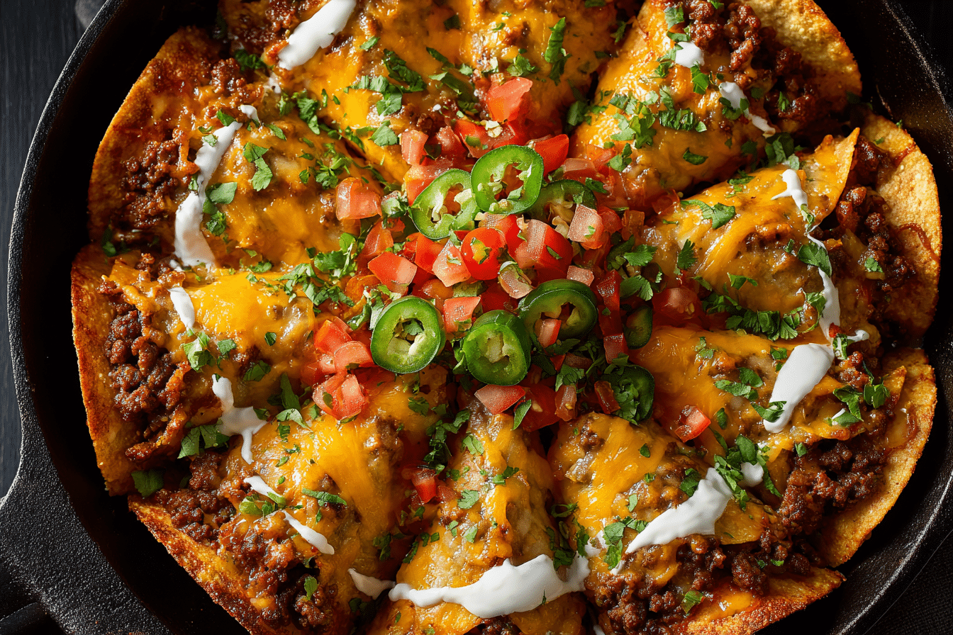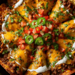 This baked skillet dish layers spiced beef, cheese, tortillas, sour cream, and enchilada sauce into a golden, bubbly meal that’s crisp, creamy, and packed with Tex-Mex flavor.