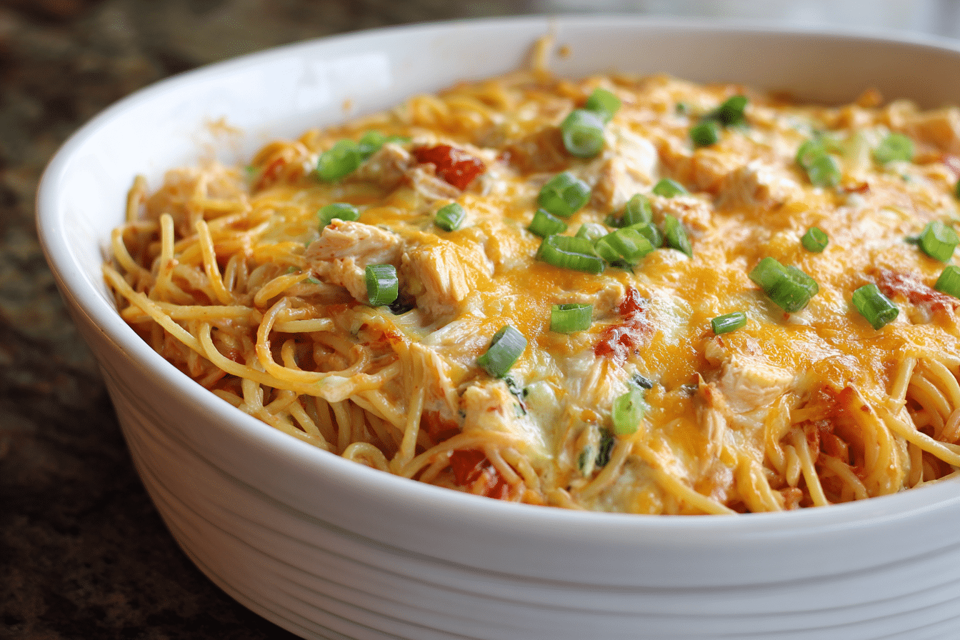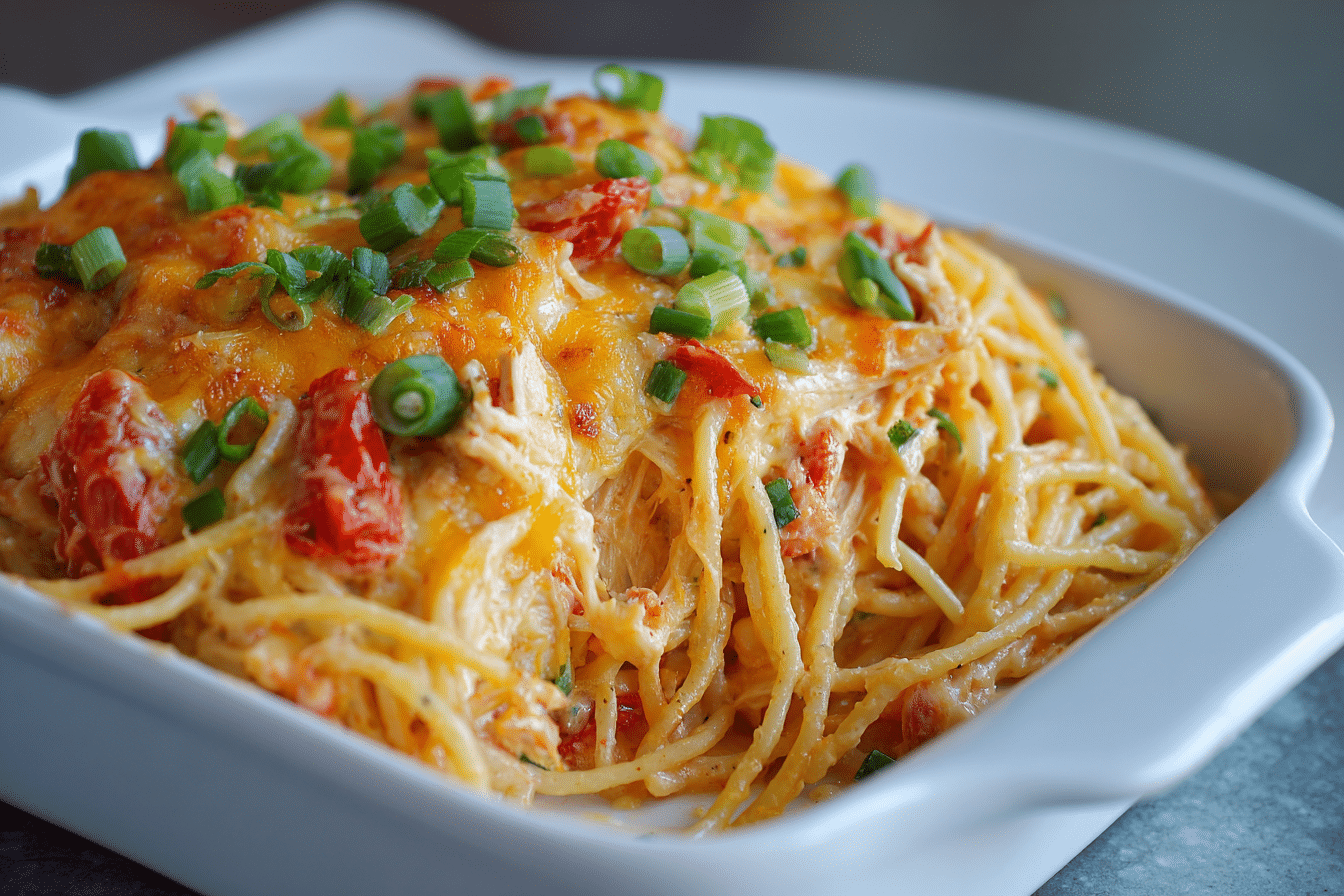 A creamy, spicy chicken spaghetti bake featuring melted cheese, Rotel tomatoes, and tender pasta for a comforting family meal.
