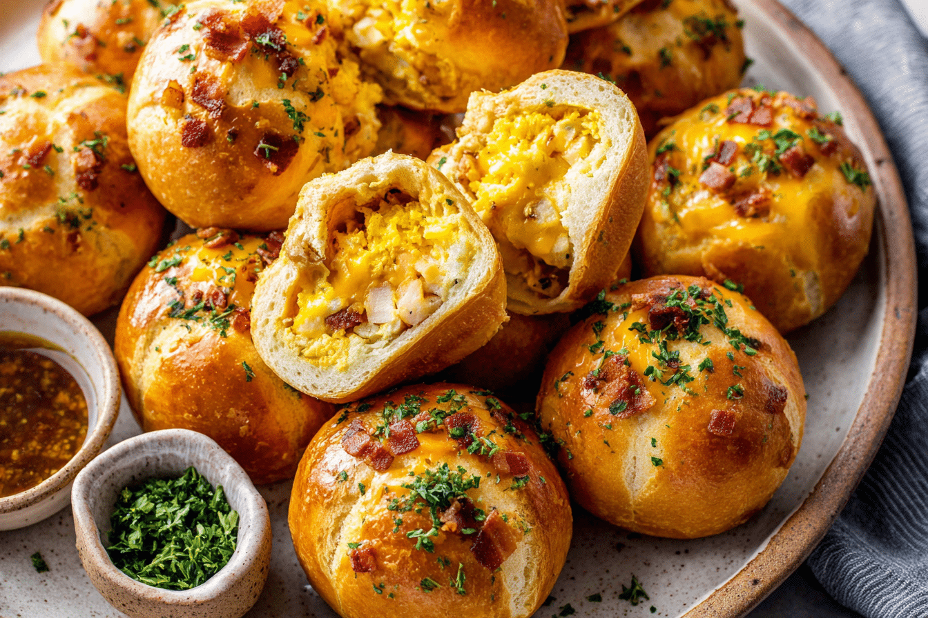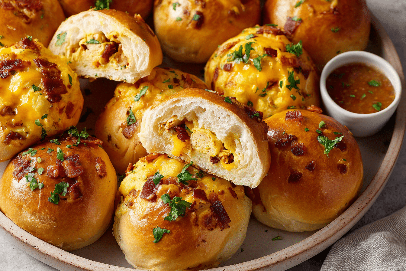 The beauty of this recipe is how each ingredient comes together inside a golden, buttery dough. You get fluffy scrambled eggs, smoky bacon, seasoned chicken, and gooey melted cheese all wrapped up in a soft biscuit shell. They’re compact, mess-free, and unbelievably satisfying.