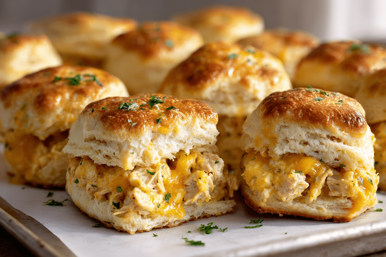 A warm, handheld breakfast featuring fluffy biscuits stuffed with chicken, scrambled eggs, and melted cheese. Great for on-the-go mornings or weekend brunch.