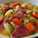 With its savory broth, tender chunks of corned beef, buttery cabbage, and a medley of vegetables, every spoonful delivers depth, richness, and old-world charm. Whether you’re making it after a corned beef dinner or starting fresh with store-bought corned beef, this soup captures the essence of Irish comfort food in one steamy bowl.