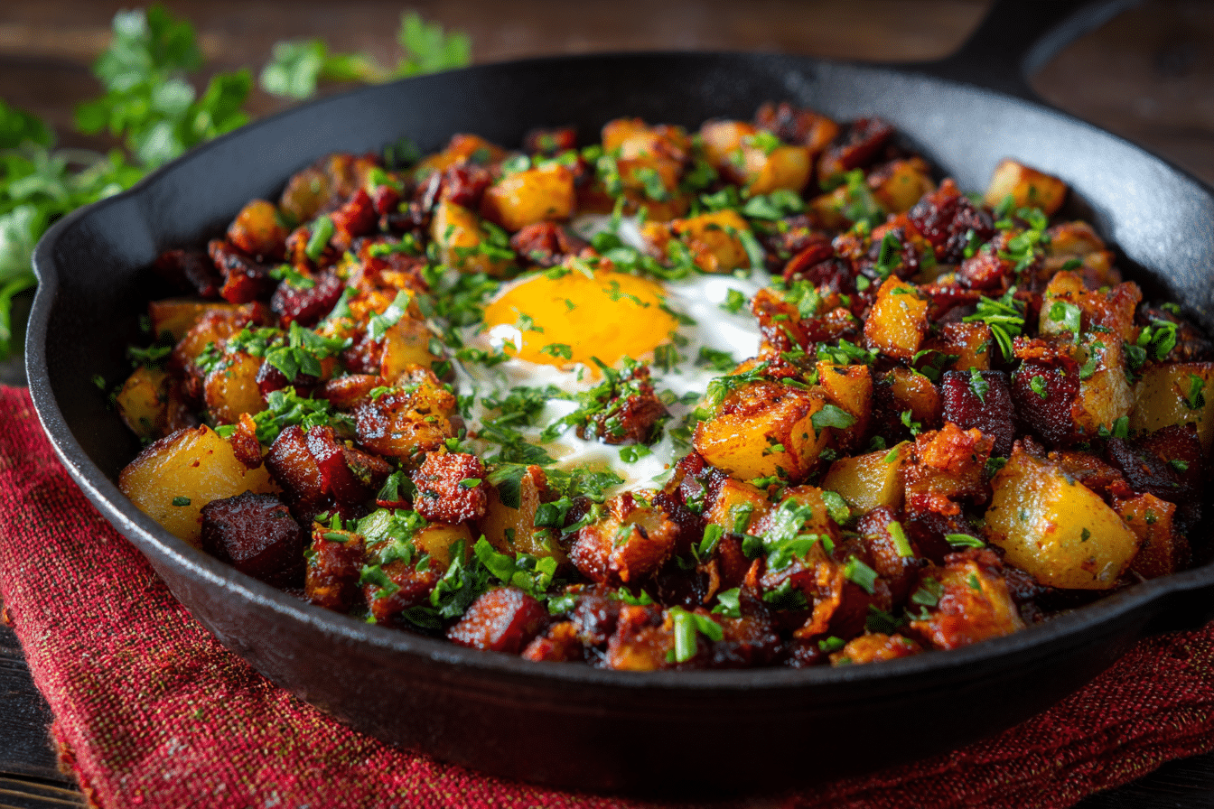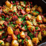 Corned Beef Hash is the ultimate comfort breakfast — a sizzling skillet dish made from crispy potatoes, savory corned beef, onions, and sometimes a fried egg on top. It’s golden, crispy, hearty, and deeply satisfying, perfect for slow weekends or a filling brunch.