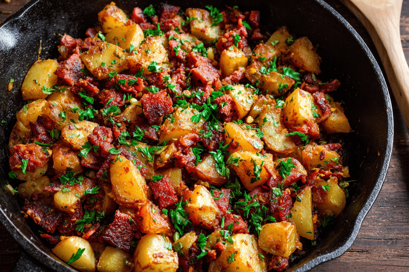A classic skillet dish of crispy potatoes, savory corned beef, and sautéed onions — perfect for breakfast, brunch, or dinner.