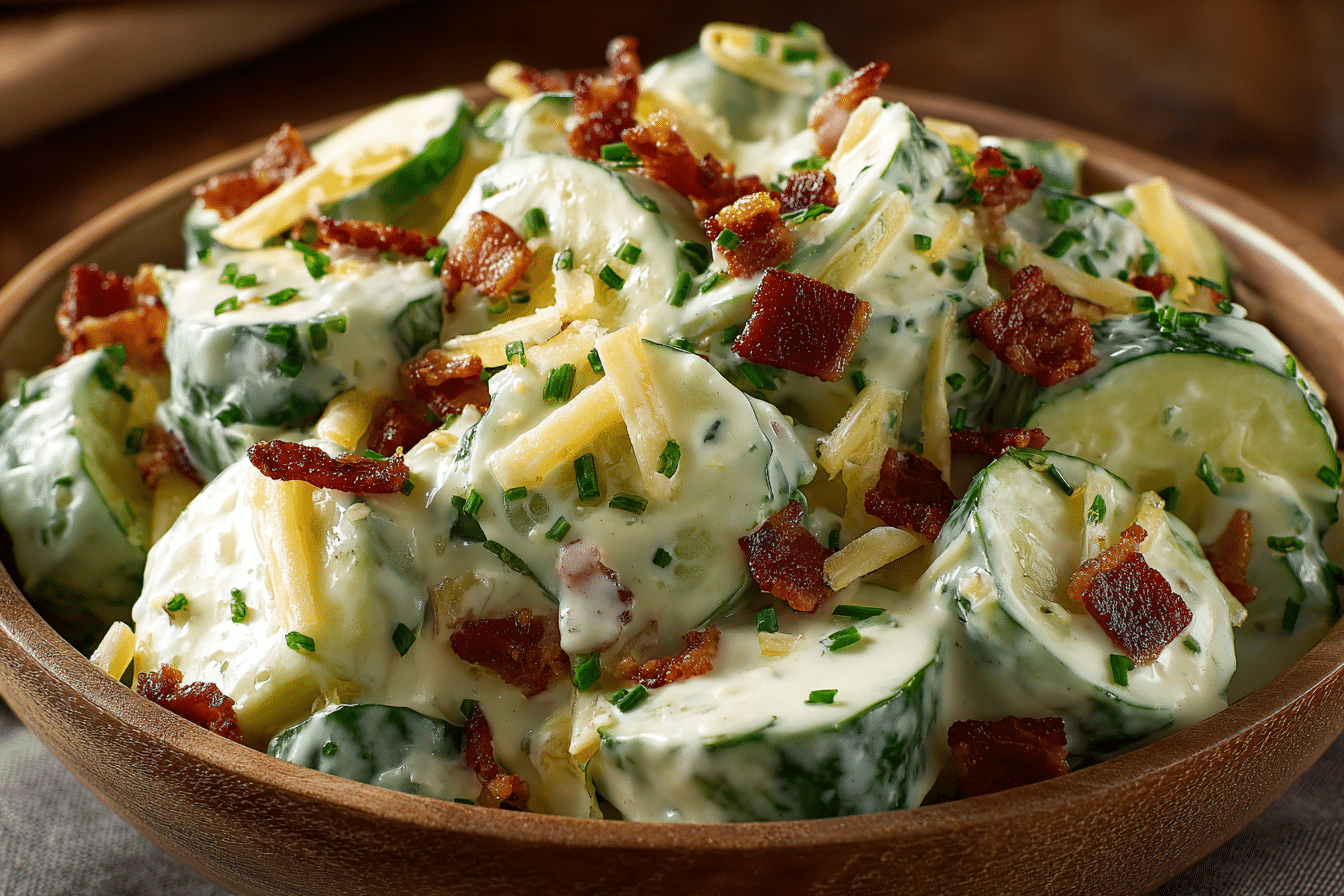 Creamy Cucumber Salad with Bacon and Cheese is a refreshing yet indulgent side dish that combines crisp cucumbers, savory bacon, and creamy cheese with a luscious dressing. This salad is perfect for summer barbecues, family dinners, or potlucks, offering a balance of crunch, creaminess, and savory flavor in every bite.