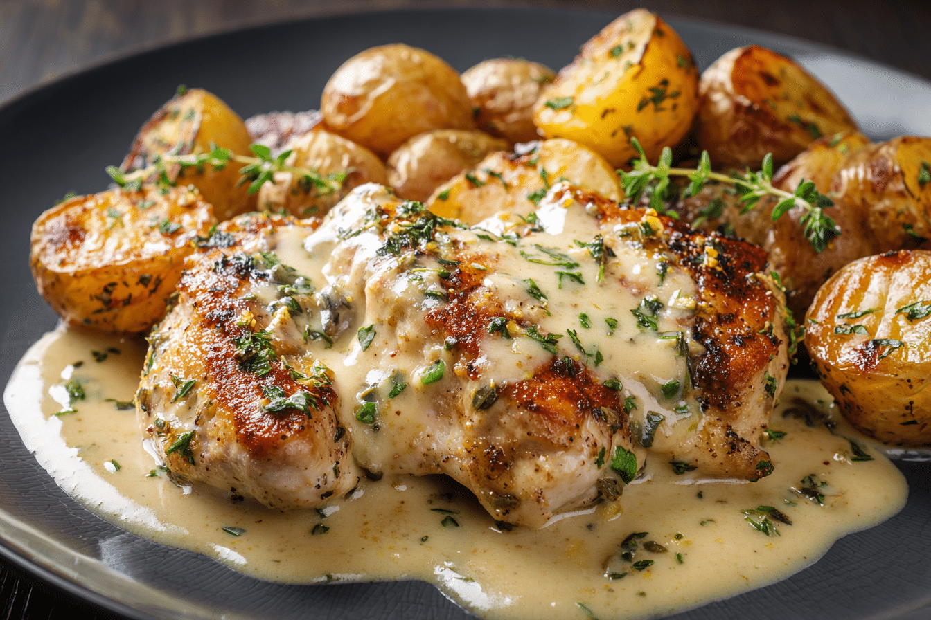 Creamy Garlic Chicken with Roasted Baby Potatoes – A Comforting One-Pan Dinner