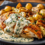 Creamy Garlic Chicken with Roasted Baby Potatoes is the kind of dish that brings everyone to the table — no questions asked. This hearty meal combines tender chicken breasts smothered in a rich, savory garlic cream sauce with crispy roasted baby potatoes that are golden on the outside and pillowy-soft inside. It’s the ultimate comfort food — filling, flavorful, and simple enough for a weeknight but elegant enough for guests.