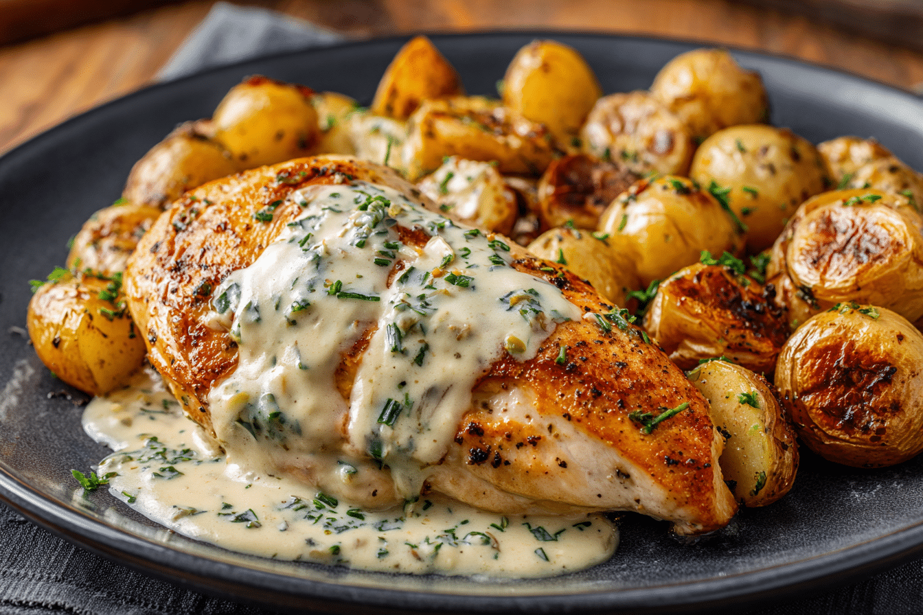 Tender chicken breasts in a creamy garlic sauce, paired with crispy roasted baby potatoes for a cozy, crowd-pleasing meal.