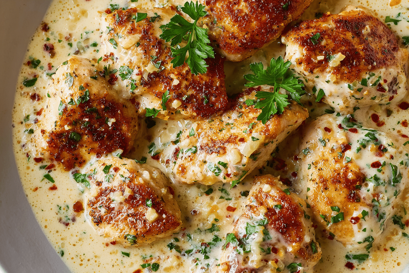 Tender pan-seared chicken in a creamy garlic-Parmesan sauce, all made in one skillet. A simple, comforting meal that’s full of bold flavor.