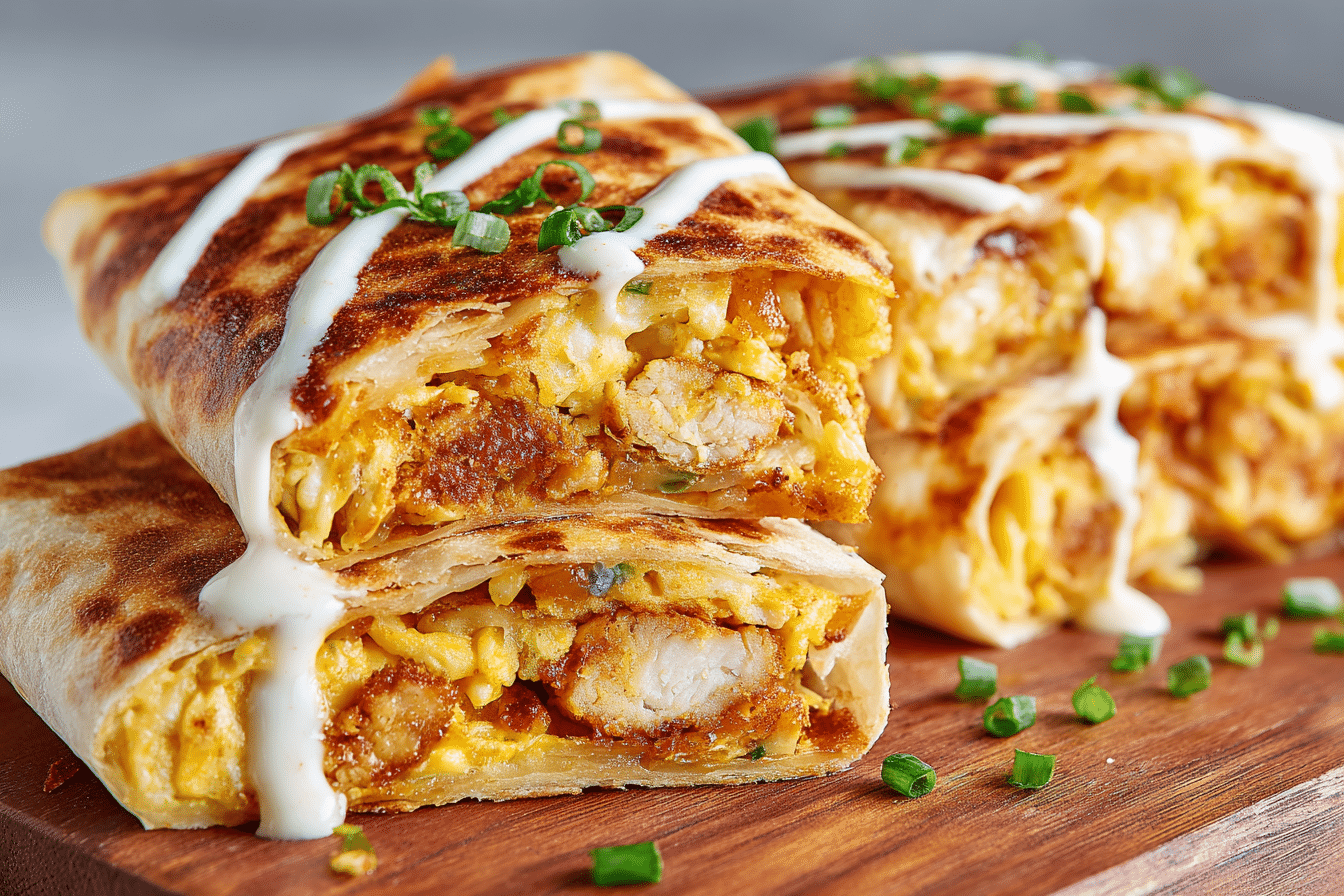 This crispy breakfast wrap combines crunchy chicken, scrambled eggs, golden hash browns, and gooey cheese in a toasted tortilla—perfect for mornings at home or on the go.