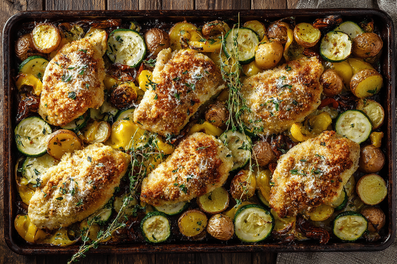 This Crispy Parmesan Crust Chicken Sheet Pan Dinner is a one-pan wonder, featuring juicy chicken with a golden, cheesy crust and a medley of perfectly roasted vegetables—all ready in under an hour.