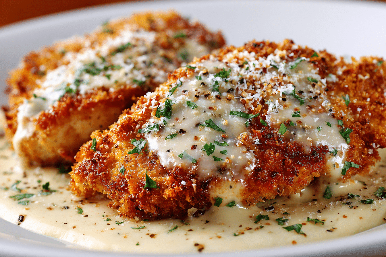 PrintCrispy parmesan-coated chicken cutlets paired with a rich, garlicky cream sauce. A crowd-pleasing, restaurant-style meal made right at home.