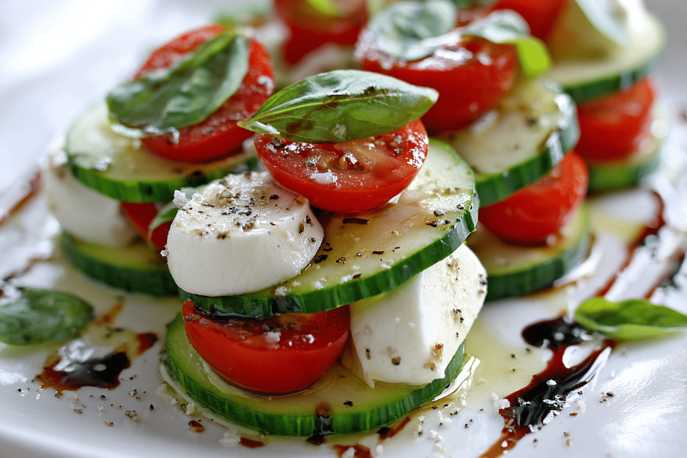 Each bite delivers contrast. Juicy tomatoes release their sweetness, mozzarella offers soft richness, and cucumber keeps the texture lively. A drizzle of olive oil and a splash of balsamic vinegar tie everything together without overpowering the produce.