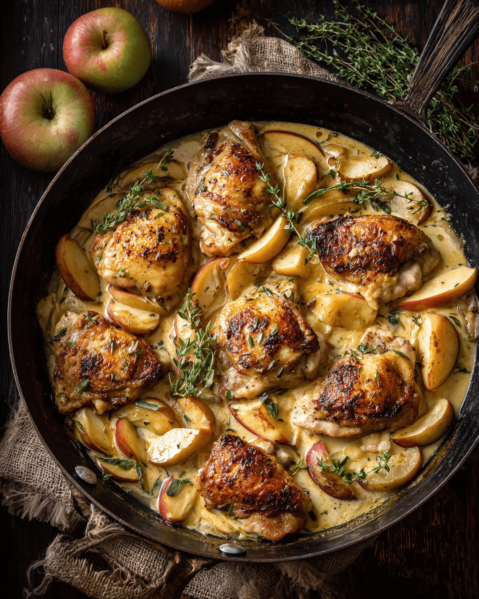 Imagine tender chicken thighs, golden brown and crisp-edged, simmering in a bubbling bath of spiced apple cider, Dijon mustard, shallots, and cream. The aroma is subtly fruity with warm herbaceous notes — perfect for cool evenings or cozy family dinners.