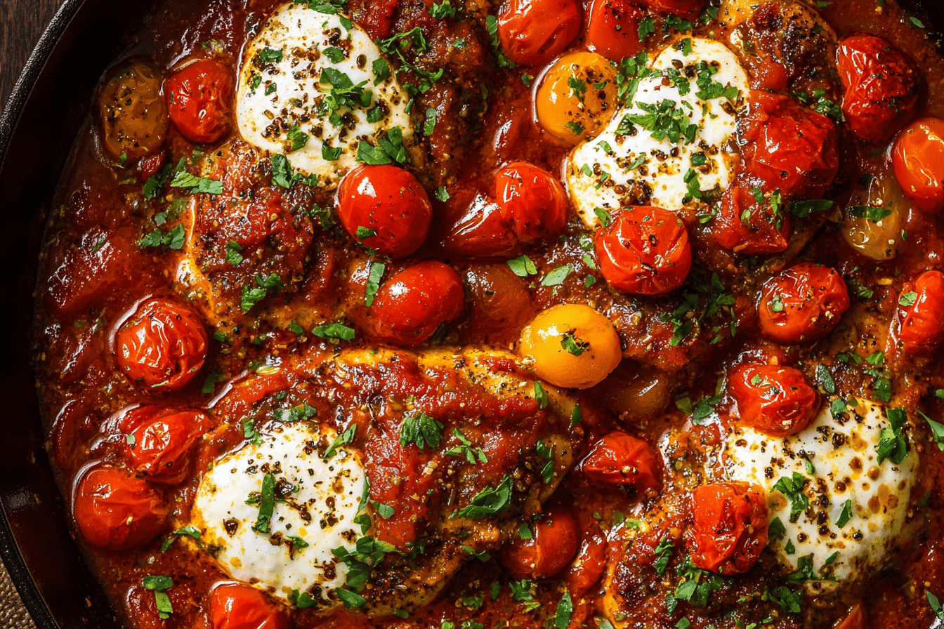 Garlic Tomato Chicken with Mozzarella is a classic one-pan dinner that brings together juicy chicken, tangy tomato sauce, and bubbling, golden mozzarella cheese. With roots in Mediterranean-style cooking, this dish channels the comforting spirit of Italian home kitchens — where rich tomato sauces simmer on the stove and cheese melts into silky, savory layers.