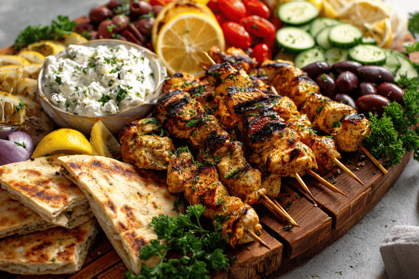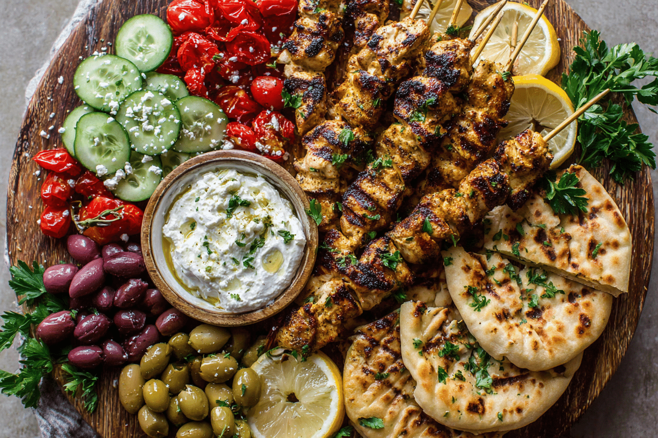 Greek Chicken Souvlaki Grazing Board with Feta Dip – A Mediterranean Feast to Share