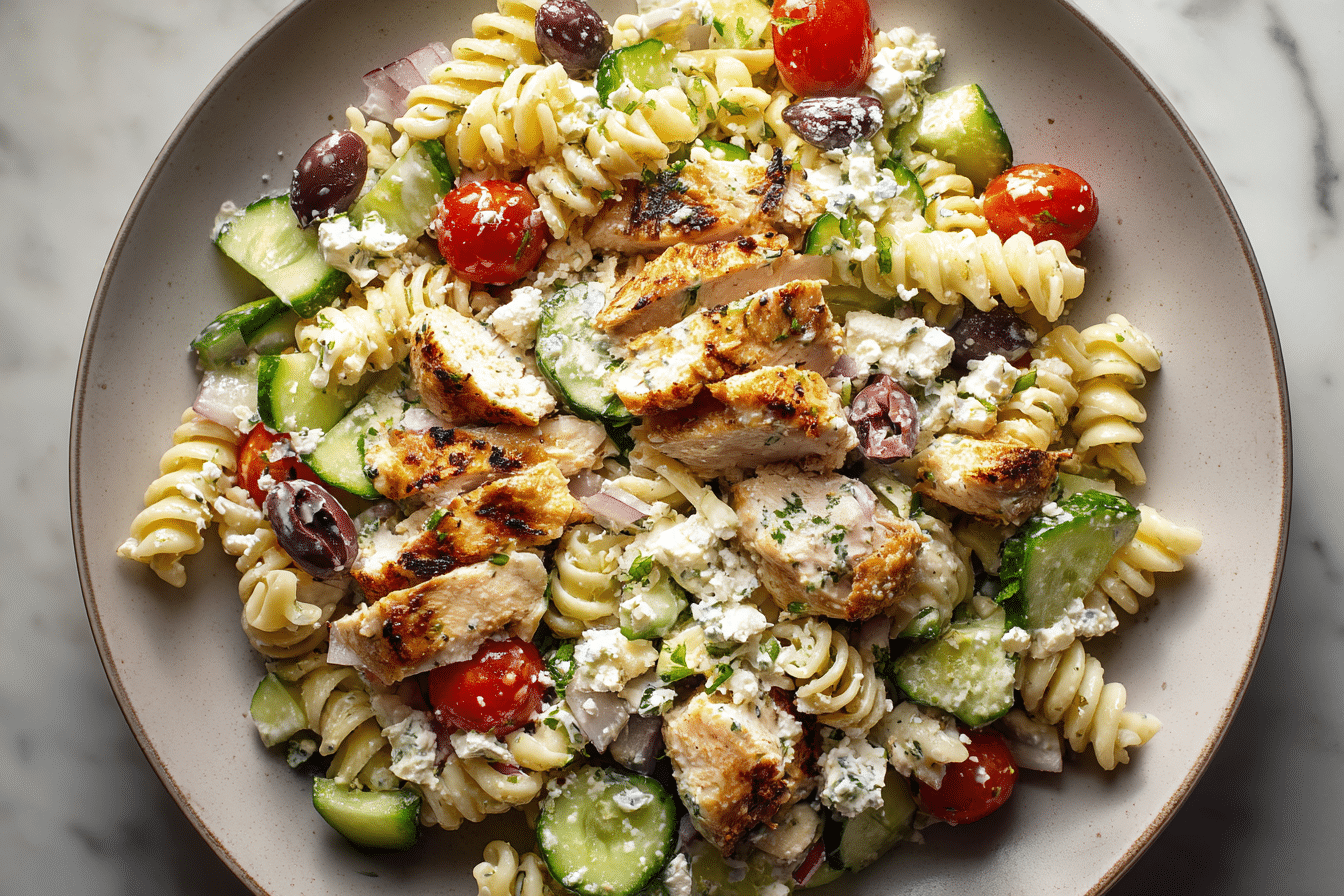 Inspired by Olivia’s Kitchen, this High Protein Greek Pasta Salad is a nutritious, satisfying dish loaded with lean protein, fresh veggies, tangy feta, and a zesty Mediterranean dressing. Perfect for meal prep, healthy lunches, or light dinners.