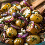 The combination of warm potatoes absorbing a tangy dressing creates layers of flavor in every bite. Juicy tomatoes add freshness, red onion gives gentle sharpness, and crumbled feta contributes a salty richness that contrasts beautifully with the soft texture of the potatoes.