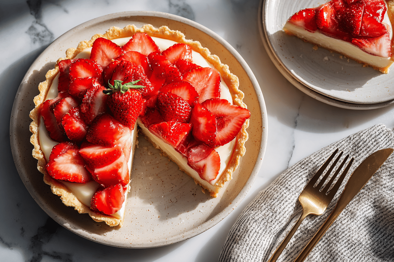 This Homemade Strawberry Tart is a classic elegant dessert featuring a buttery crisp tart shell, silky vanilla cream, and fresh strawberries on top. It looks bakery-fancy but is surprisingly easy to make at home—perfect for brunch, tea time, or special occasions.