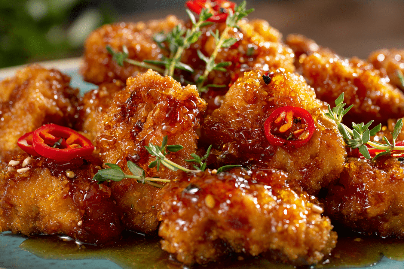 Juicy fried chicken with a golden, crispy crust and a bold hot honey glaze. Sweet, spicy, and crunchy all in one unforgettable dish.