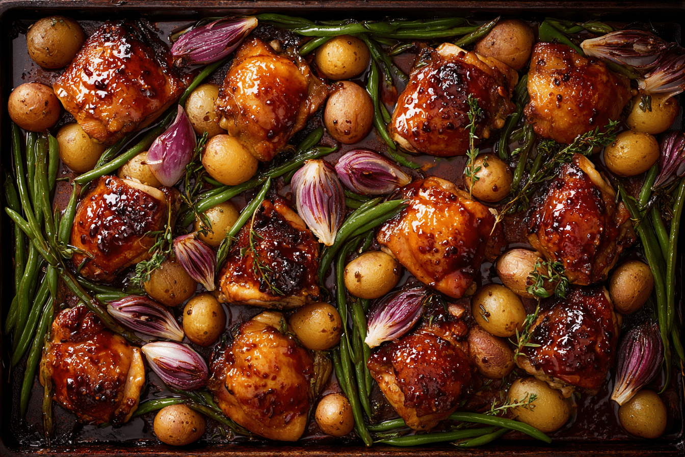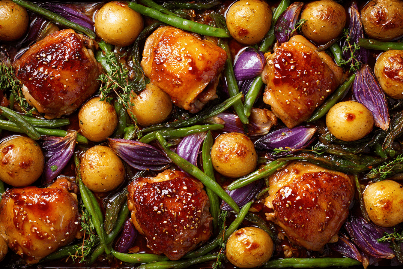 A one-pan chicken dinner featuring juicy roasted thighs glazed in a hot honey garlic sauce, paired with tender, caramelized vegetables. Easy to make and full of bold, sweet-spicy flavor.