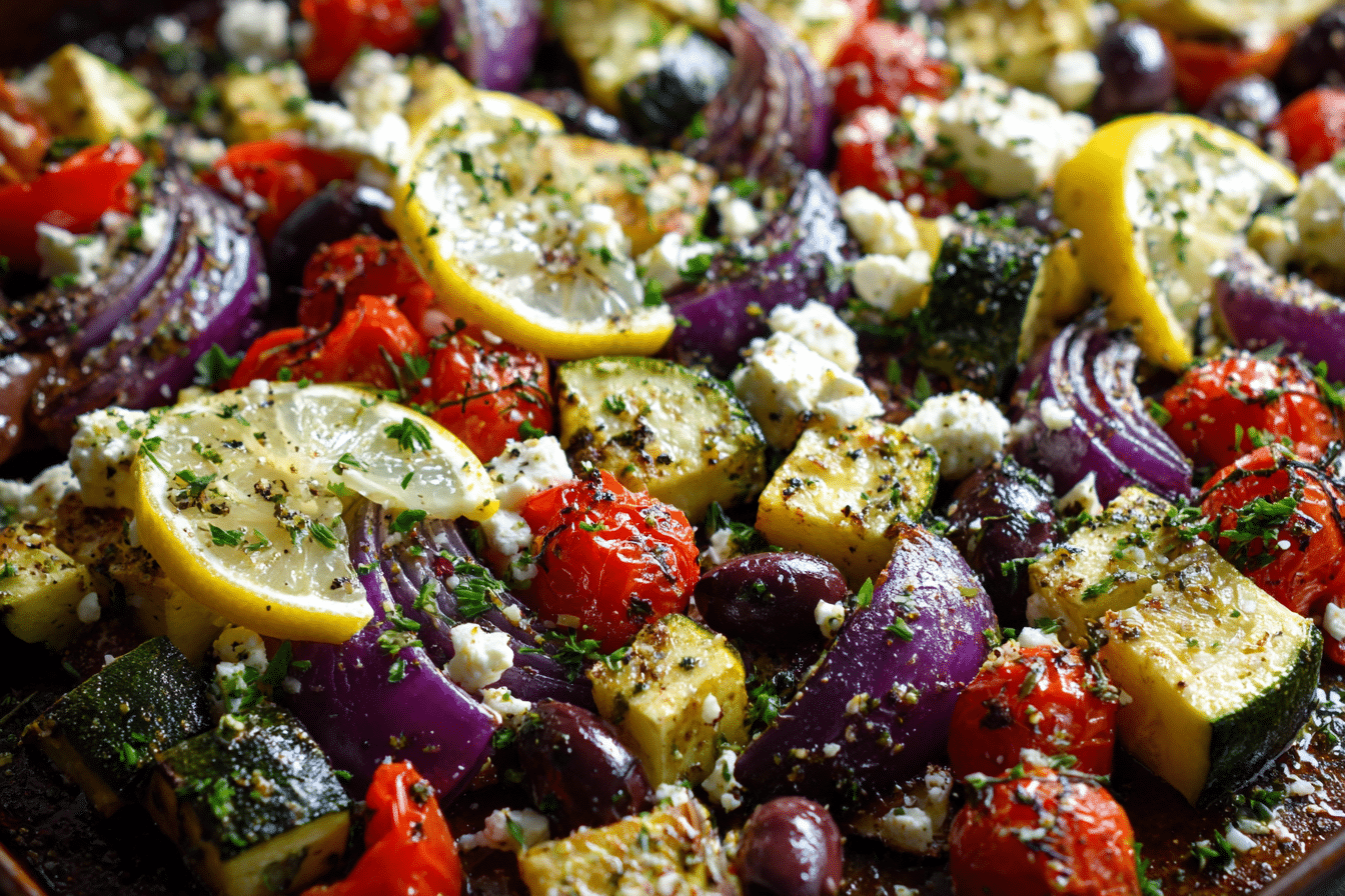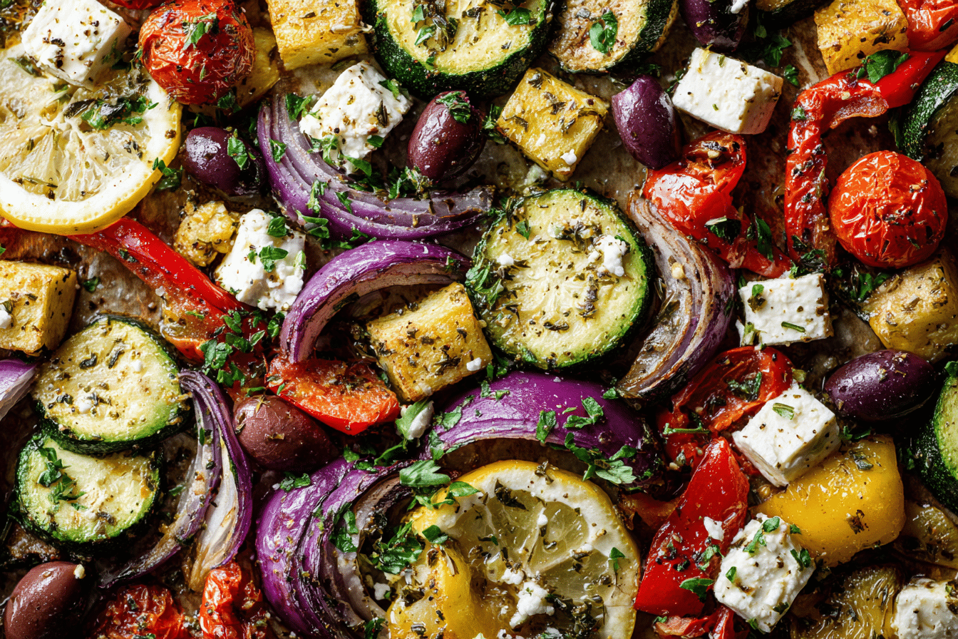One Pan Greek Vegetables are vibrant, roasted, and bursting with Mediterranean flavor. Tossed in olive oil, garlic, oregano, and lemon, then roasted until caramelized and tender, this colorful dish is simple yet incredibly satisfying.