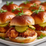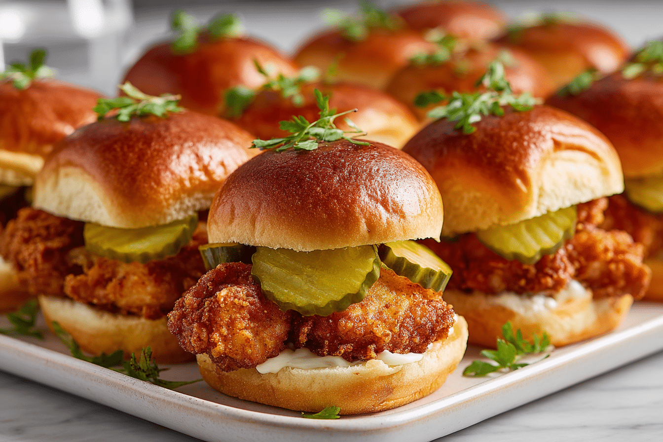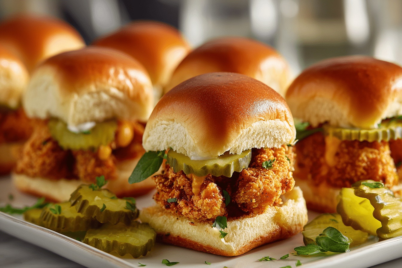 Crispy, juicy chicken bites marinated in tangy pickle juice and fried to golden perfection, then served on soft slider buns with your favorite toppings.