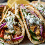 PrintA quick and healthy homemade version of Greek chicken gyros—featuring marinated chicken, creamy tzatziki, and fresh veggies wrapped in warm pita.