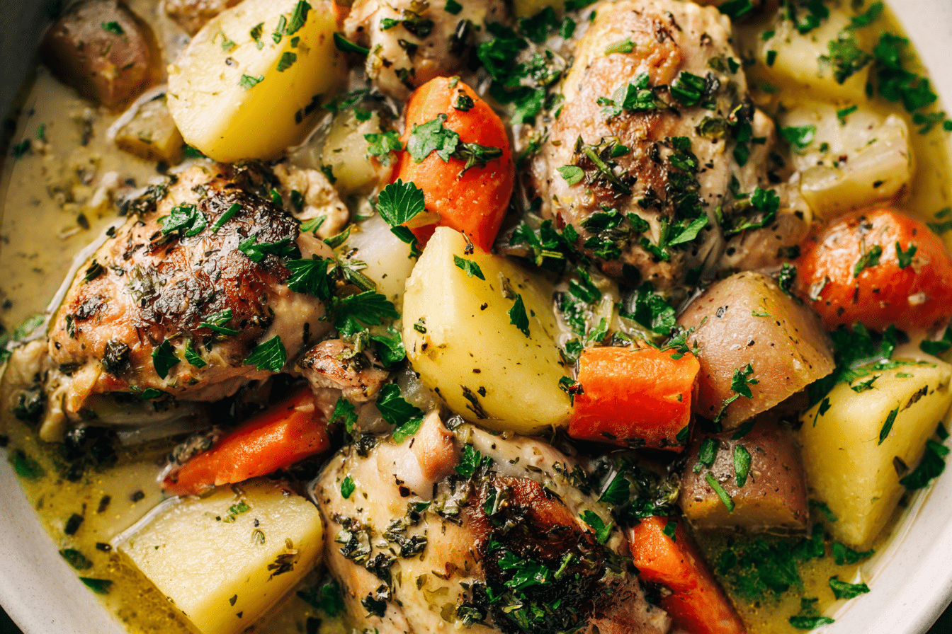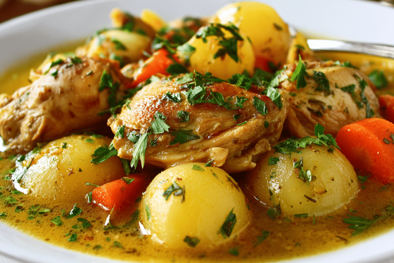 A hearty slow-cooked chicken stew with tender meat, root vegetables, and savory herbs — perfect for effortless meals that warm you up from the inside out.
