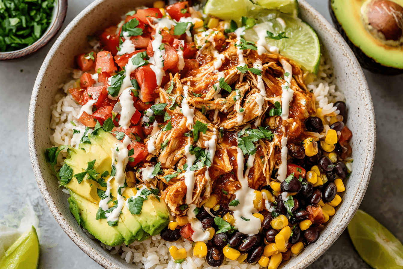 This Slow Cooker Chicken Burrito Bowl is a hands-off, flavorful dinner that’s perfect for busy weeknights or meal prep. Tender, shredded chicken cooks all day with spices, beans, and rice, creating a protein-packed, vibrant dish that’s ready to top with your favorite burrito bowl fixings.