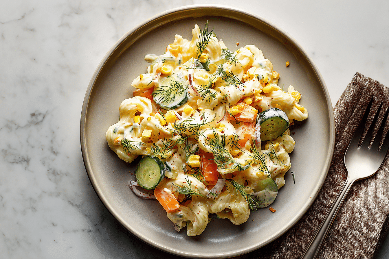 Bu Soslu Makarna Salatası, yumuşak makarna, taze sebzeler ve nefis bir yoğurtlu-mayonezli sos ile hazırlanan, hem doyurucu hem de ferah bir salatadır. Çay saatleri, davetler ve piknikler için harika bir seçenektir.