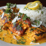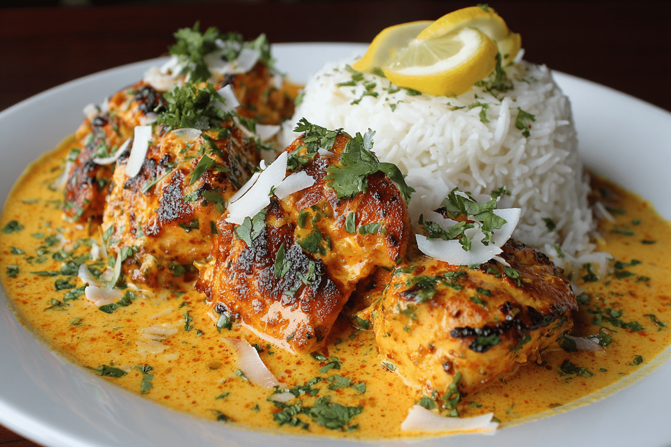 The richness of coconut milk balances the heat, creating a silky, aromatic sauce that clings to every piece of chicken. Bell peppers, onions, and fresh cilantro bring depth, color, and freshness, making every bite feel like a tropical escape.