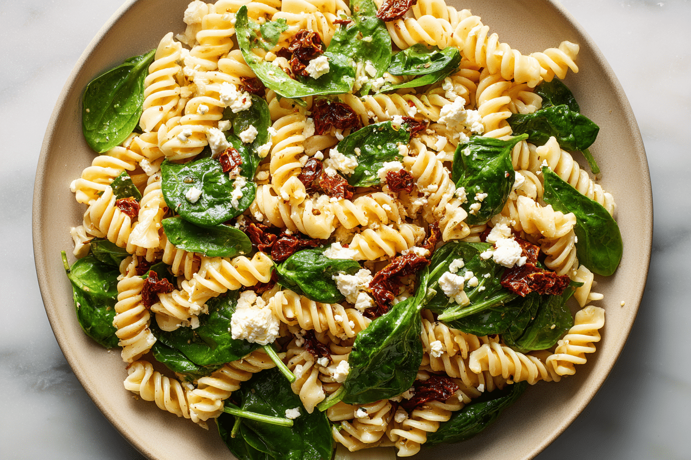 This Spinach Pasta Salad with Sun-Dried Tomatoes & Feta is a vibrant, flavor-packed dish featuring tender pasta, fresh spinach, rich sun-dried tomatoes, and creamy feta cheese tossed in a light, zesty dressing. Perfect for meal prep, picnics, or a quick, satisfying lunch.