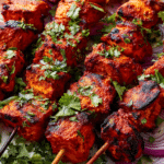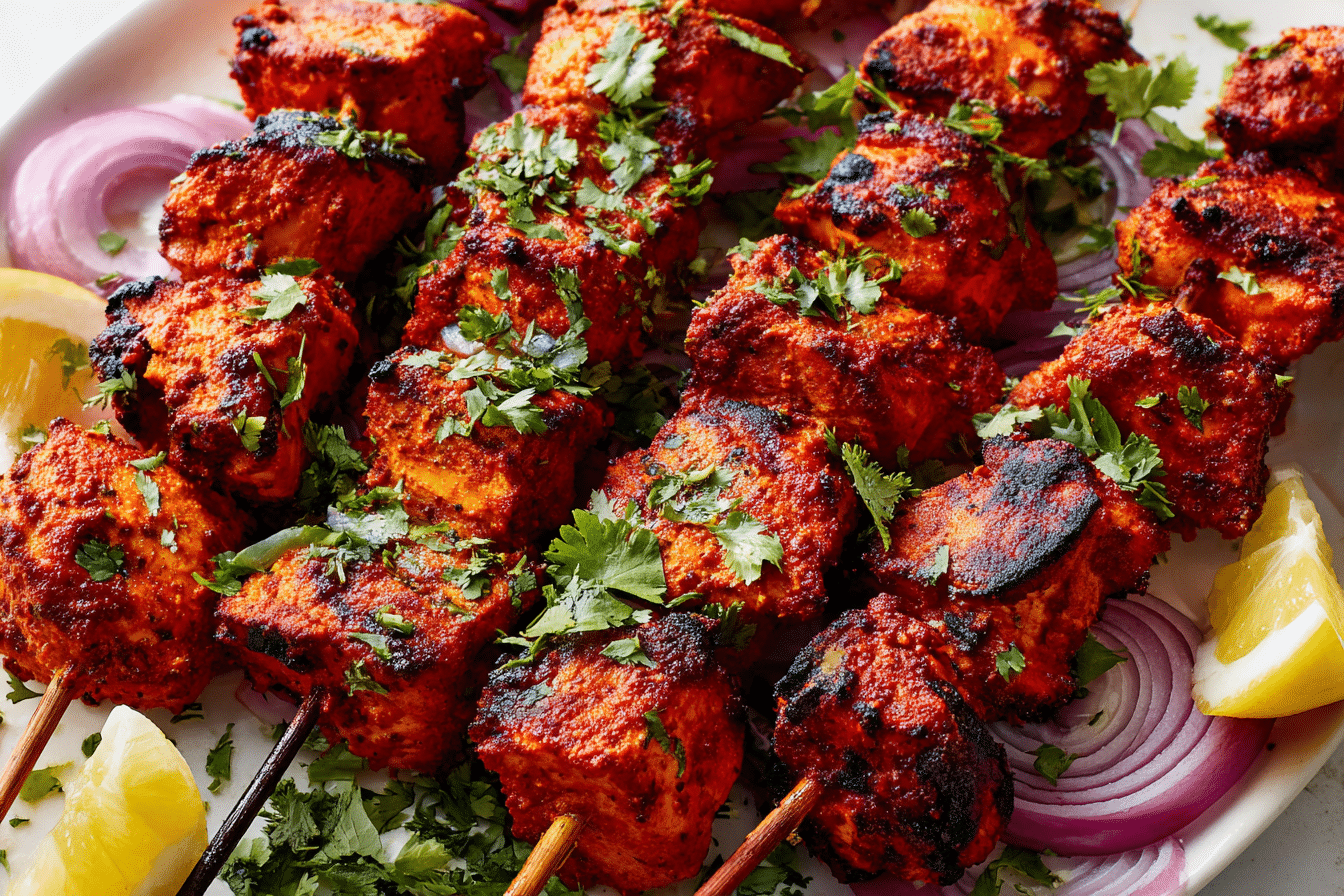 This dish draws from India’s tandoor-style cooking, where food is traditionally prepared in clay ovens over intense heat. While you don’t need a tandoor to make these, you can recreate the experience with simple techniques at home. The marinade, made with creamy yogurt and bold spices, infuses the chicken with flavor and tenderness. Once cooked, the skewers deliver juicy, smoky pieces of meat that are hard to resist.