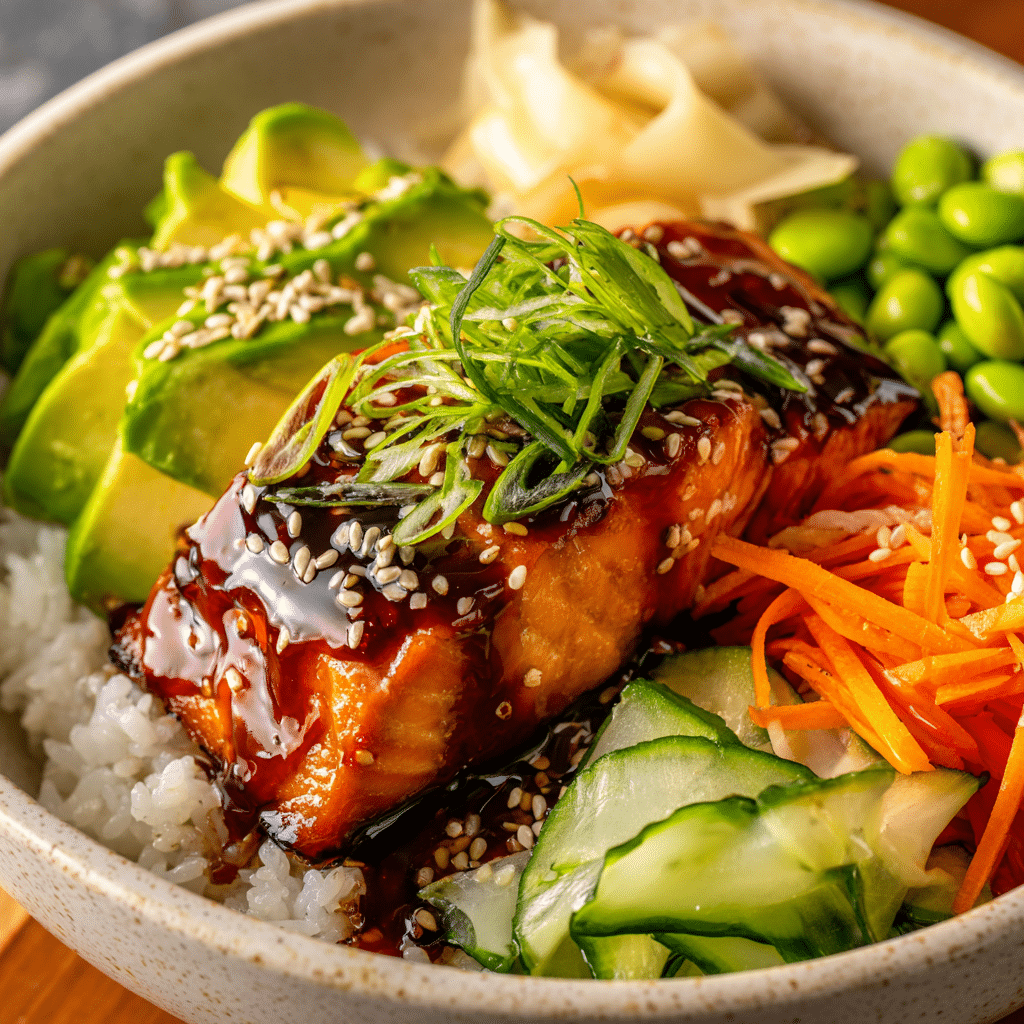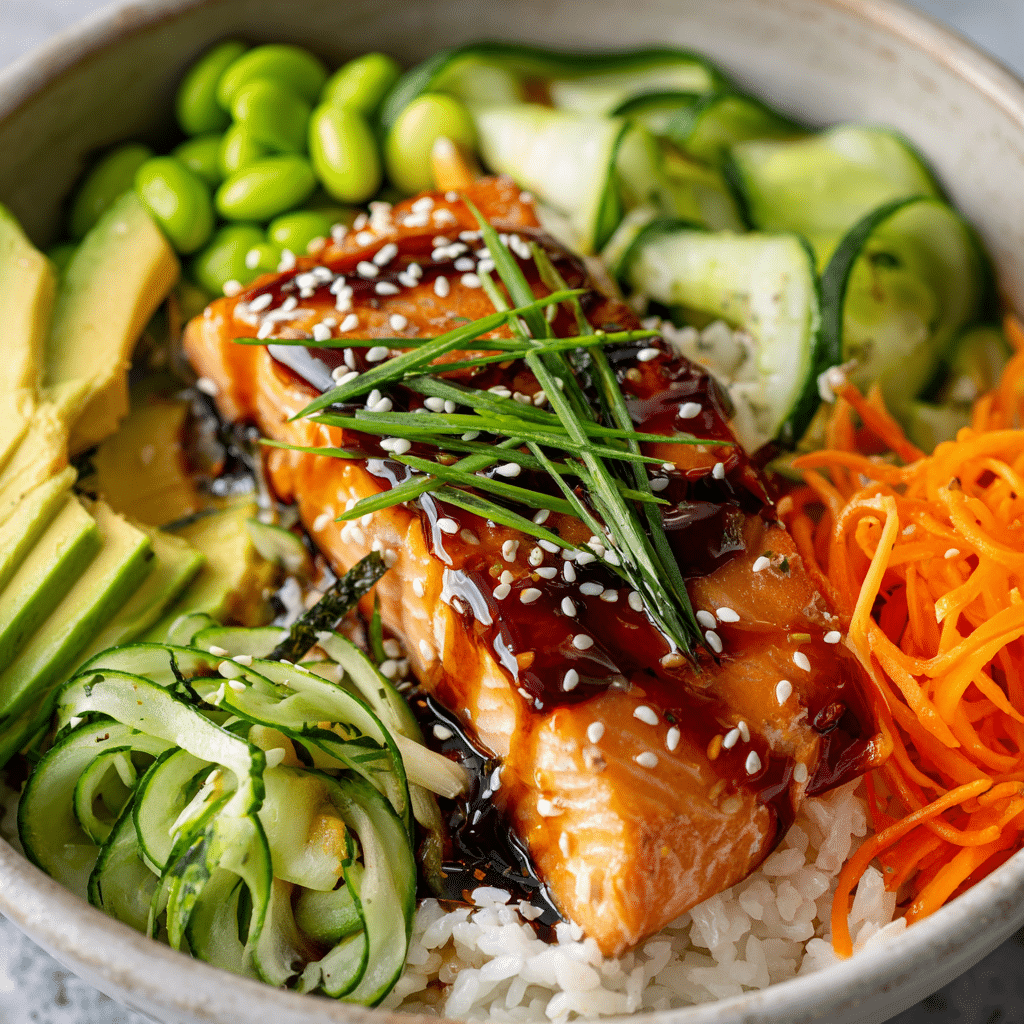 Inspired by Japanese flavors and classic teriyaki-style cooking, this bowl balances sweet-savory glazed salmon with fresh, crunchy vegetables and seasoned rice. It’s perfect for weeknight dinners, meal prep, or when you’re craving sushi in a simpler, more approachable format.