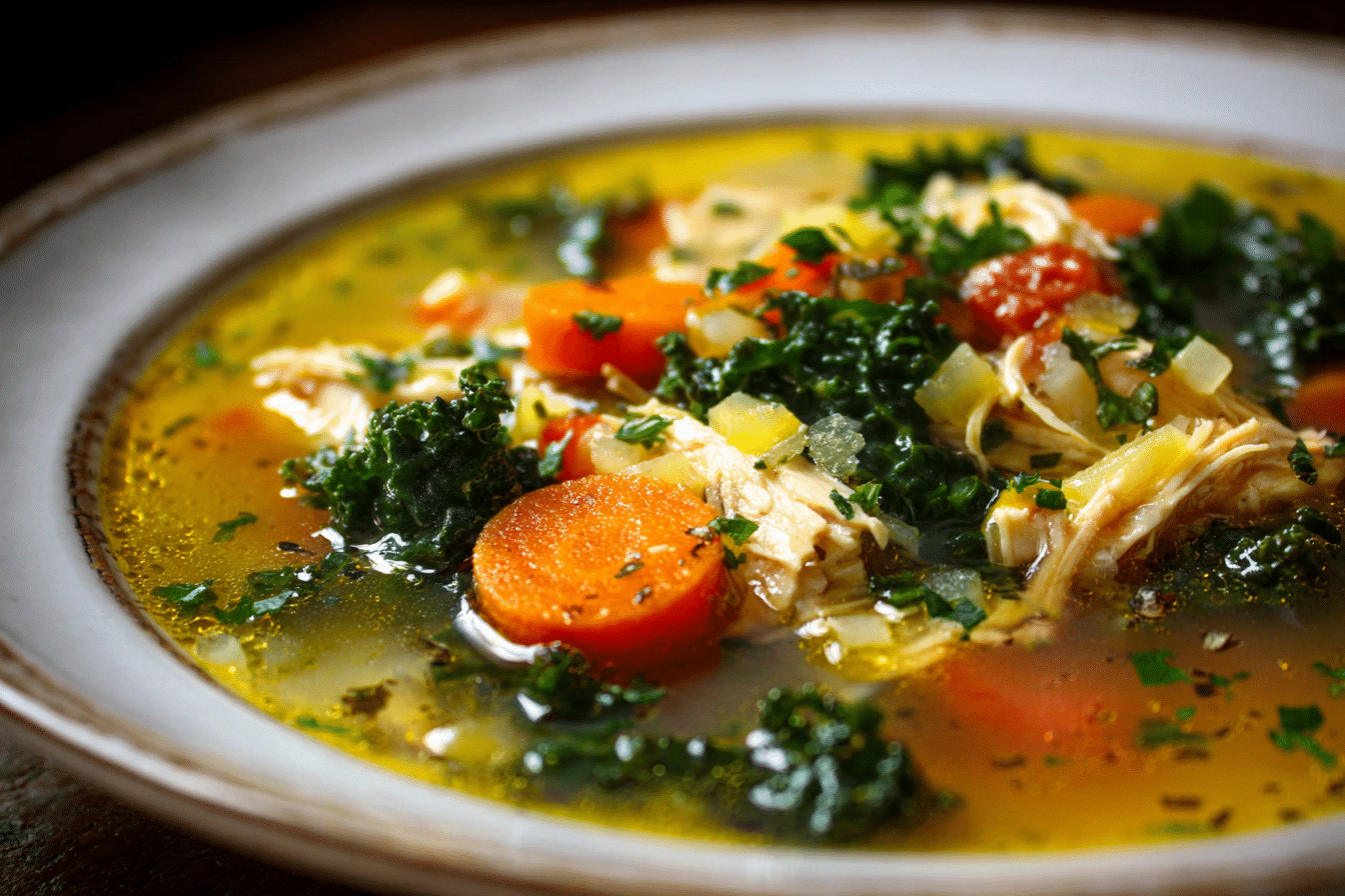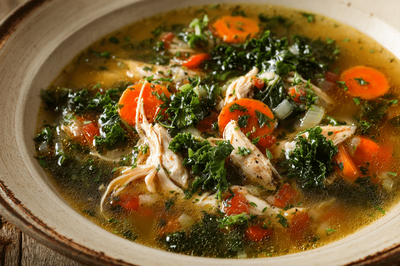 A rustic Italian soup with shredded chicken, cannellini beans, kale, and herbs simmered in a savory tomato-infused broth — hearty, healthy, and full of Tuscan flavor.