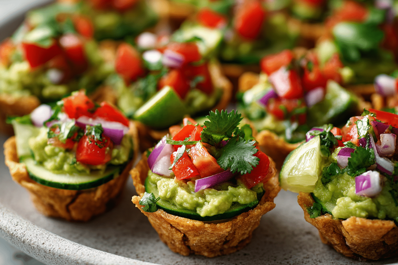 Cups/Base – Use mini tortilla cups, lettuce cups, cucumber slices, or even bell pepper halves to hold the guacamole.