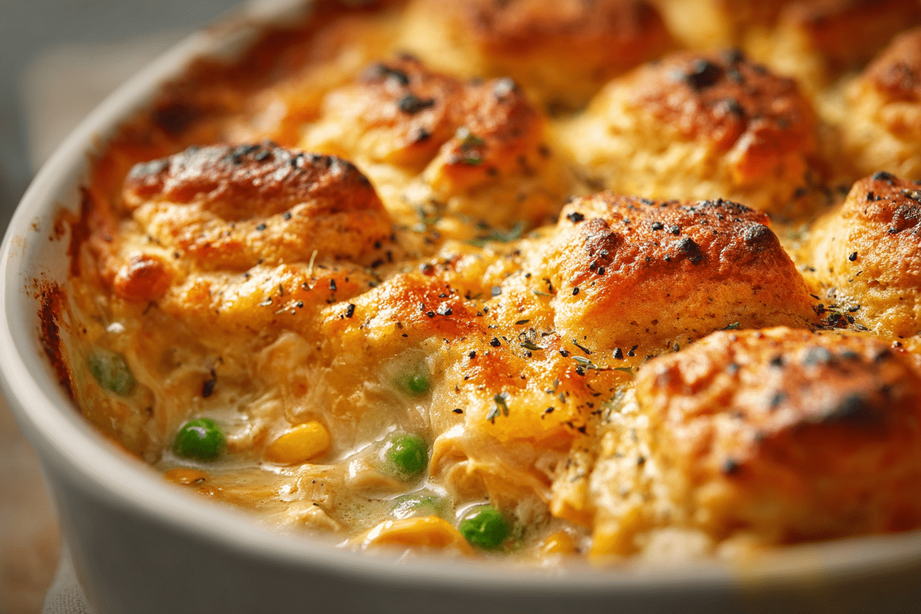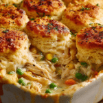 A creamy, layered casserole with shredded chicken, vegetables, gravy, and a buttery biscuit topping — inspired by the viral TikTok favorite.